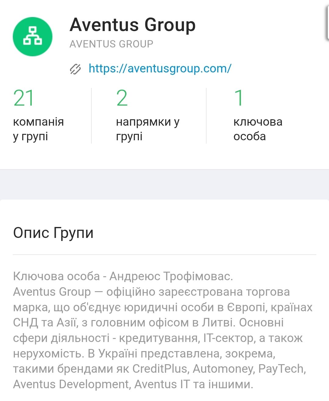 Останній є ключовою особою корпоративної групи “Aventus Group”, до якої система Youcontrol відносить “П-18”. Окрім цієї компанії, до вказаної групи відносяться ще понад два десятки суб’єктів господарювання, зайнятих у сферах кредитування, ІТ-сектору, а також нерухомості. В Україні ця група представлена, зокрема, такими брендами як CreditPlus, Automoney, PayTech, Aventus Development, Aventus IT та іншими. Але взагалі ця торгова марка об’єднує компанії з різних країн Європи та Азії.